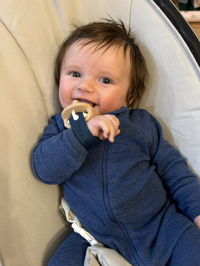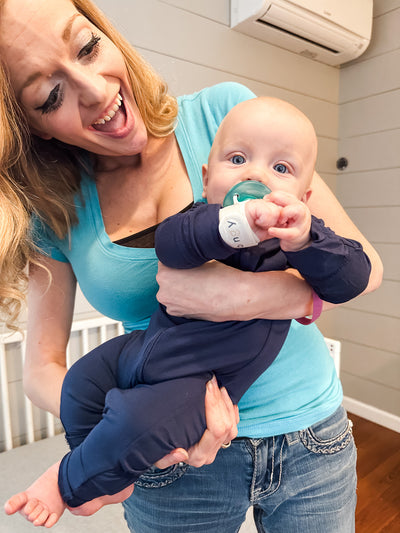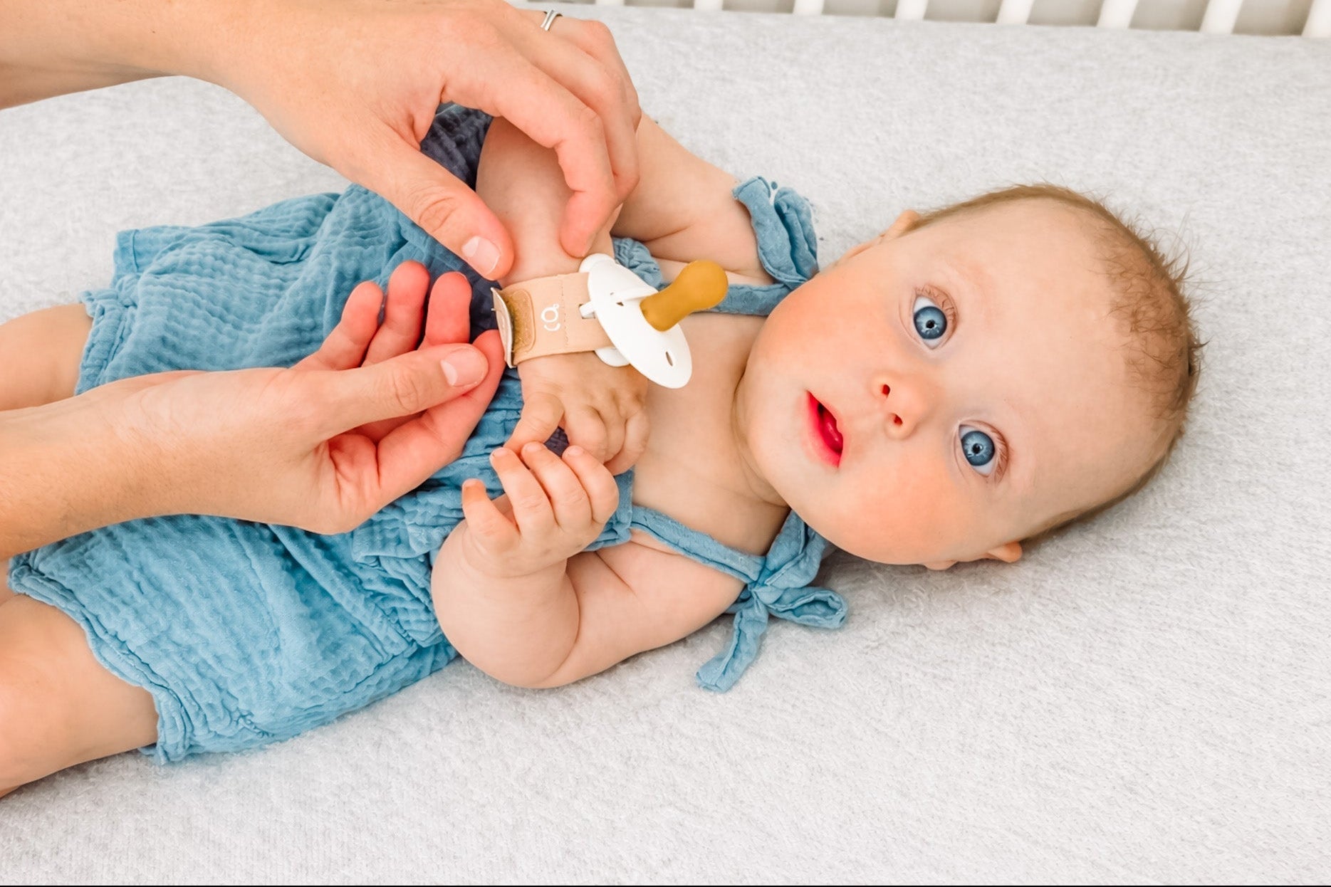 "Talk about a game changer! My baby doesn’t yet have the dexterity to hold a paci by himself, but he can easily raise his hand to his mouth. Since using this band, my baby can just lift his wrist to his mouth and BAM, he soothes himself!"