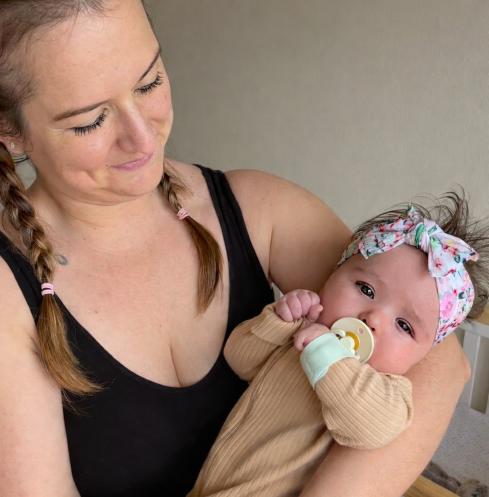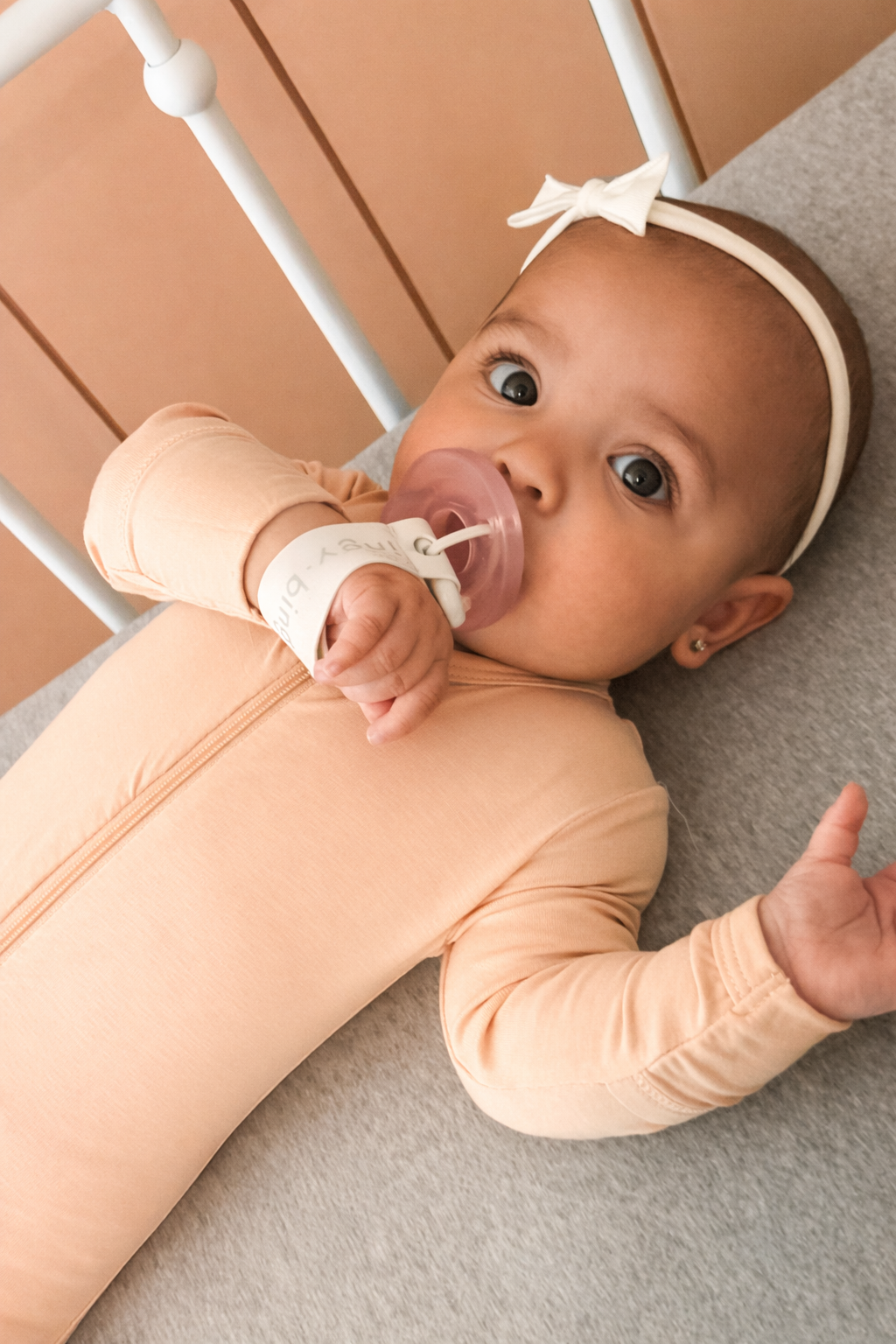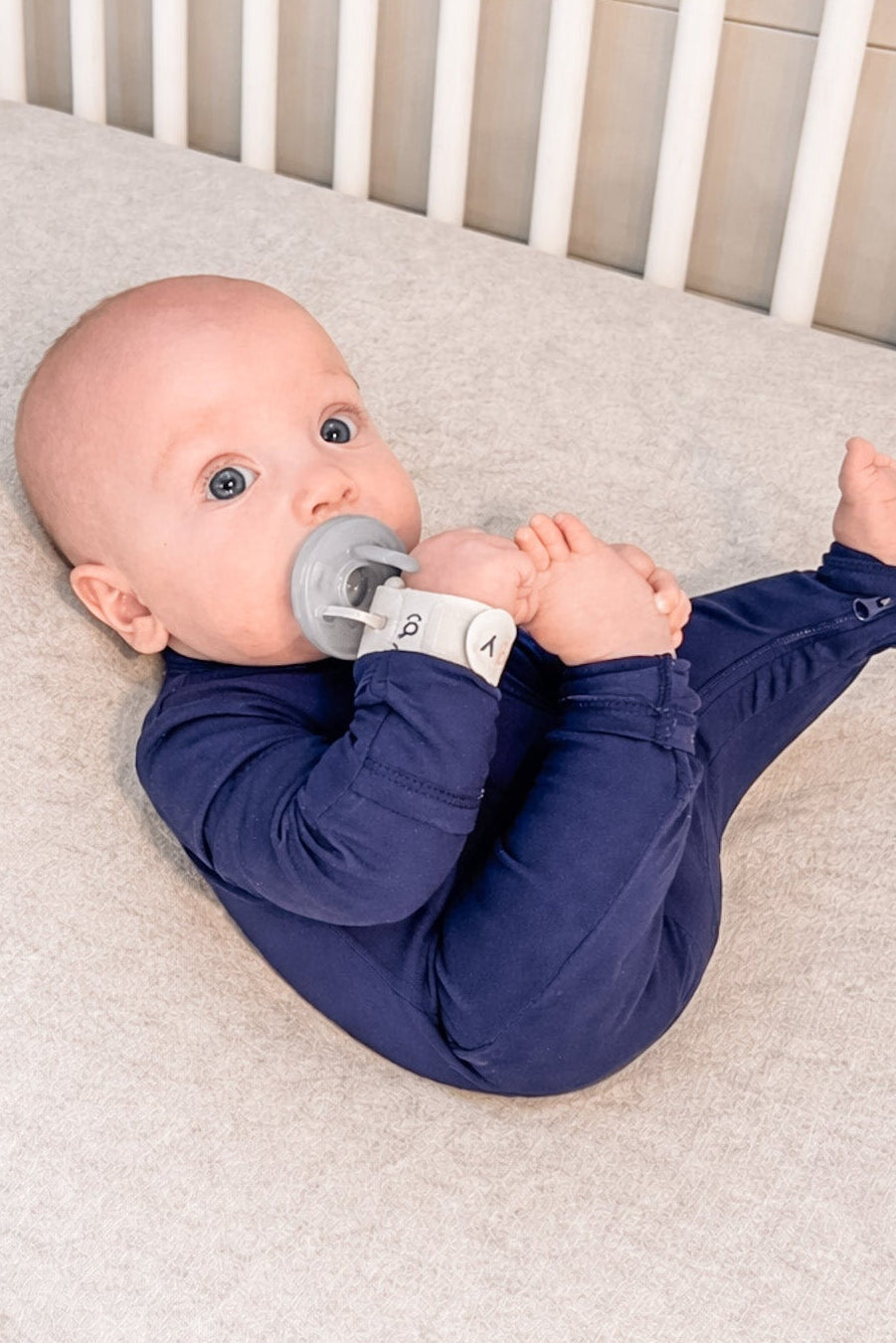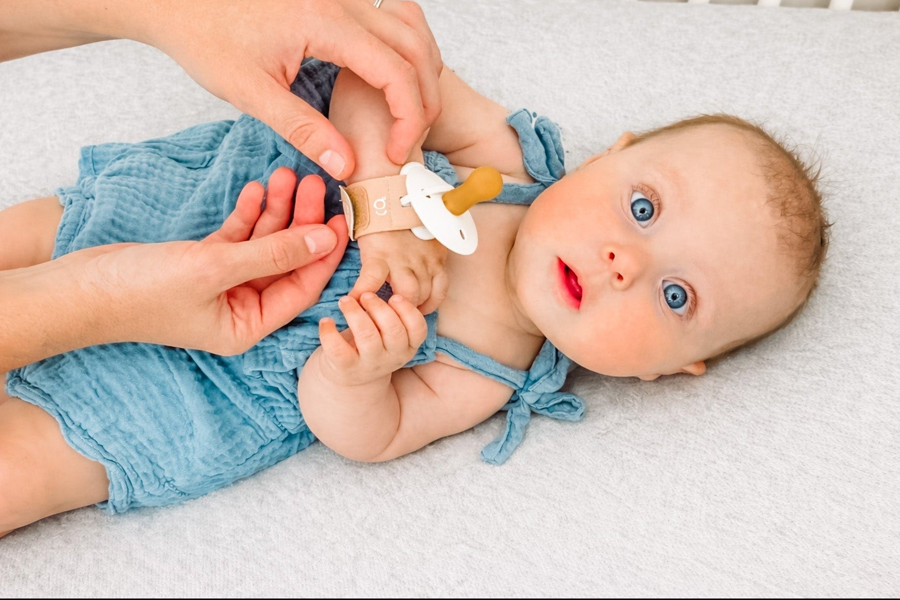 “Gone are the days of running through your house searching high and low for a pacifier. We love this pacifier accessory! This pacifier wristband just makes me feel more comfortable as a parent. No shame if you use a pacifier clip, but those make me anxious due to possible strangulation and choking hazards. I love that Lucy has this SAFE pacifier wristband to help her self-soothe! She’s 4.5 months and can find and use it all on her own!”